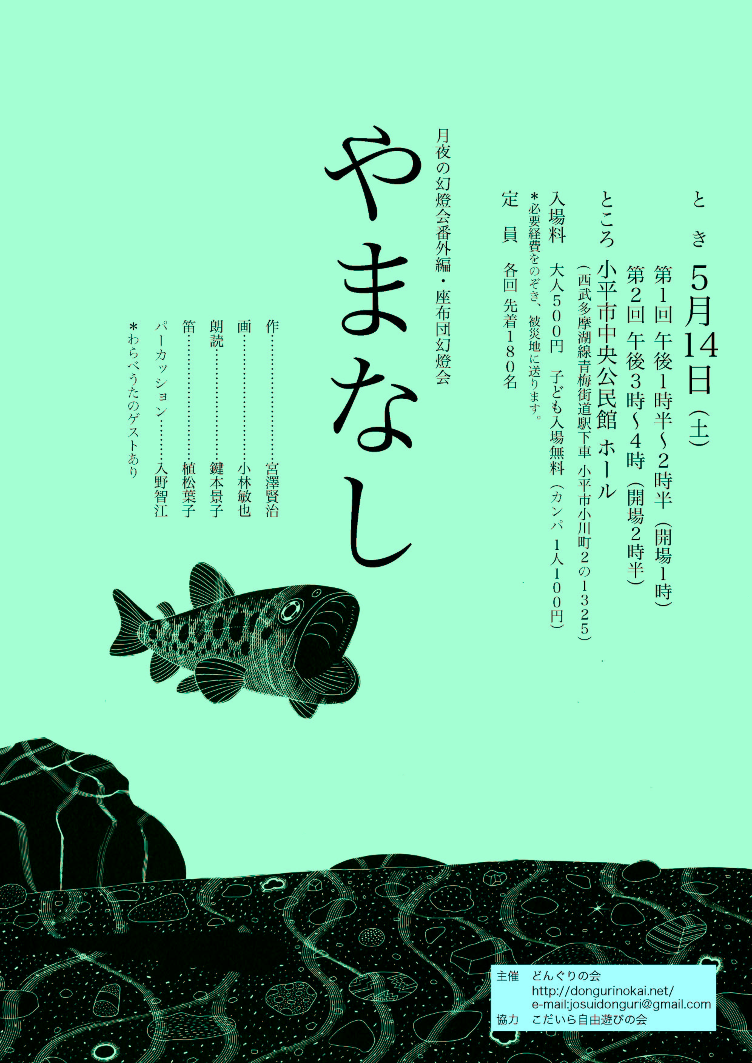 『2009年秋から小平の雑木林で続けている「月夜の幻燈会」宮澤賢治の物語を、小林敏也さんの画、オリジナルの音楽と共に、林の空気の中でお話を伝えています。 今回は絵はありませんが、セロ弾きの佐々木さんをゲストにお招きして、『セロ弾きのゴーシュ』をお話しします。日本の笛と、アジアや西洋の楽器の音色とともに、賢治の言葉はどんな風にムリウイの空間を伝わっていくのでしょう?みなさんの心の中に自由なイメージの翼を広げ、賢治ワールドをお楽しみください。』